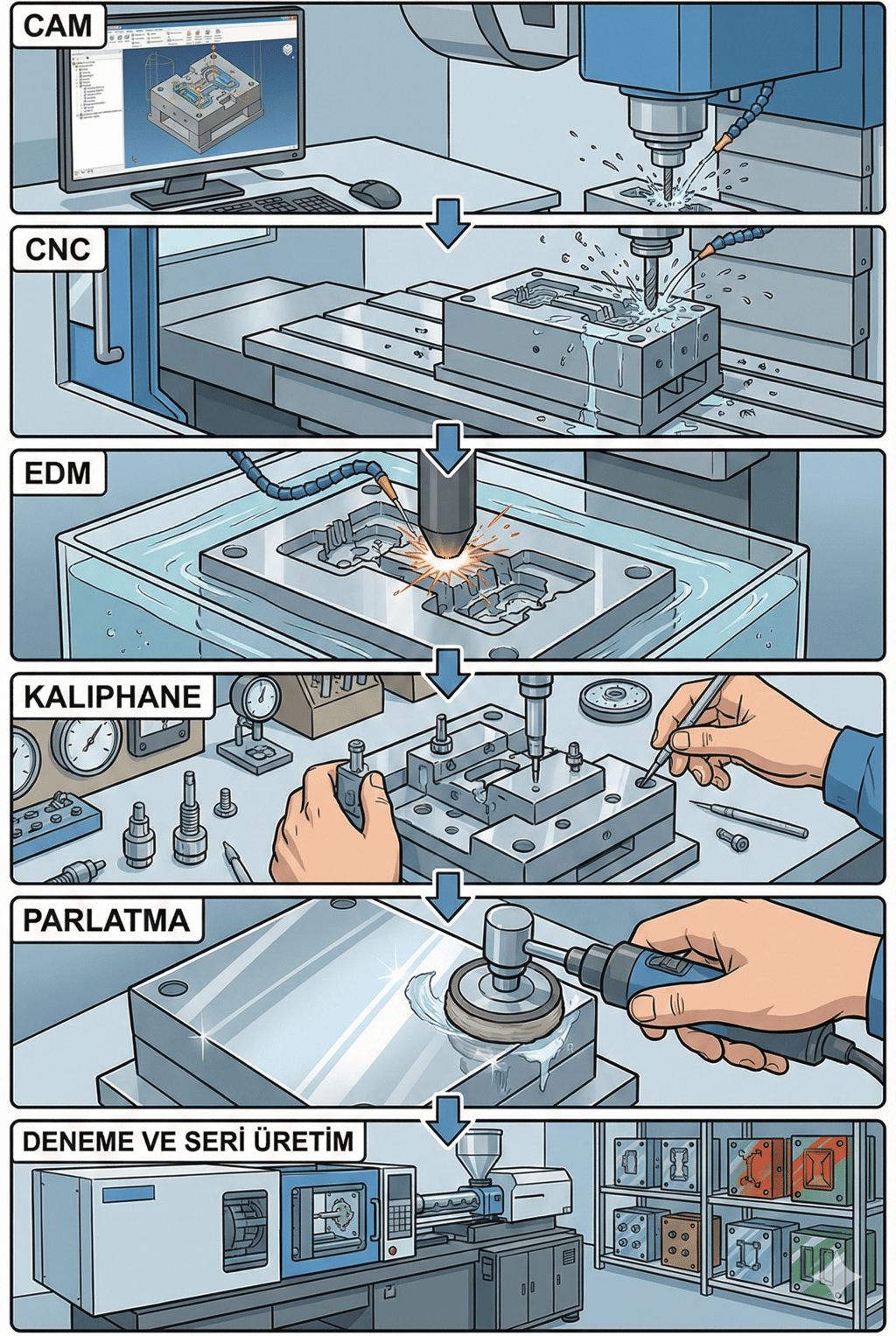 Kalıp imalatının son aşaması olan Parlatma prosesi üzerinde önemle ve titizlikle durarak yüksek görsel ve boyutsal hassasiyet sağlanmaktadır.
