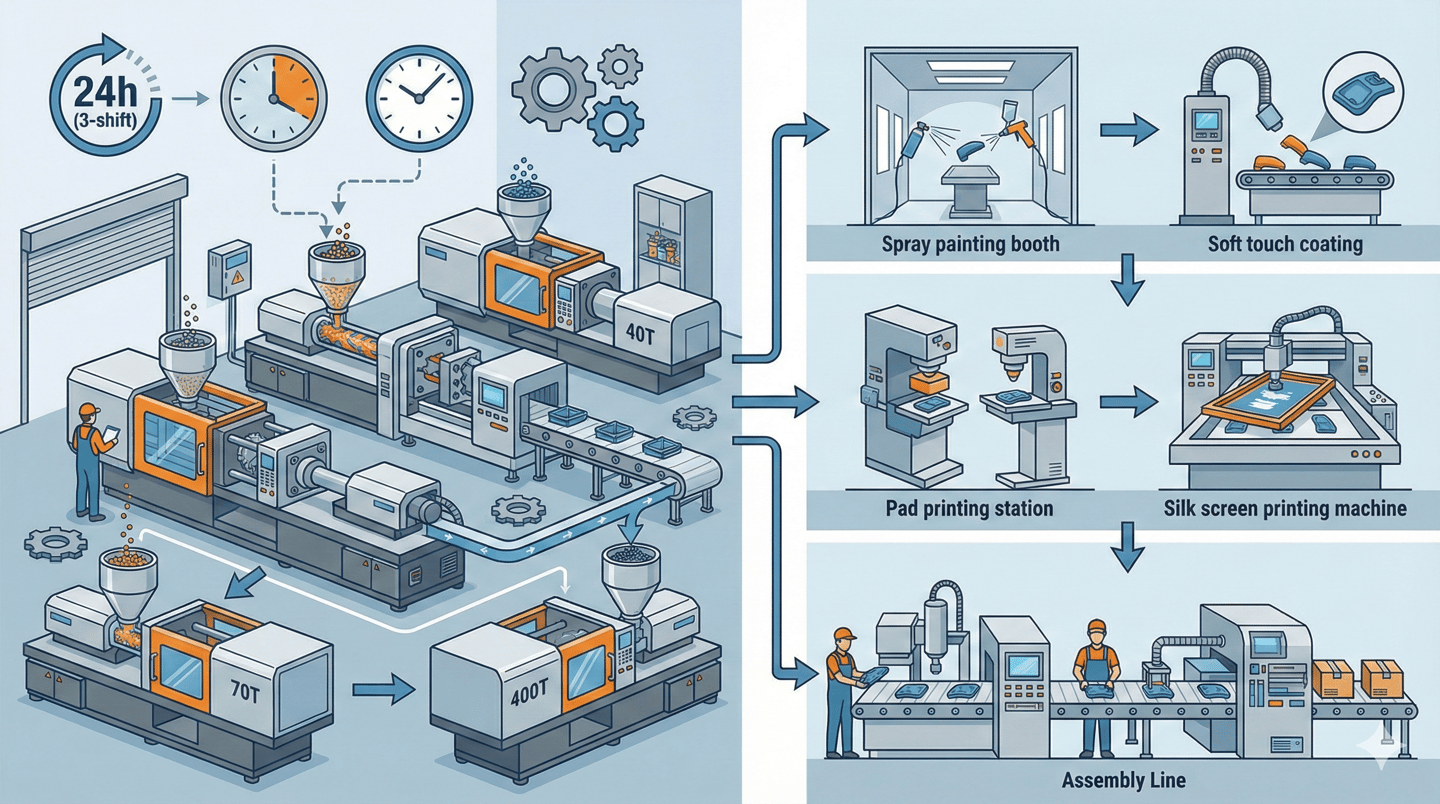 Müşterilerimizin talepleri doğrultusunda, yaş boyama ve soft touch prosesleri de üretim akışına katılarak, sorunsuz parça tedariği yapılmaktadır. Tampon ve İpek serigrafi makinalarıyla müşterilerimizin talepleri doğrultusunda bünyemizde serigrafi uygulamaları yapılmaktadır.